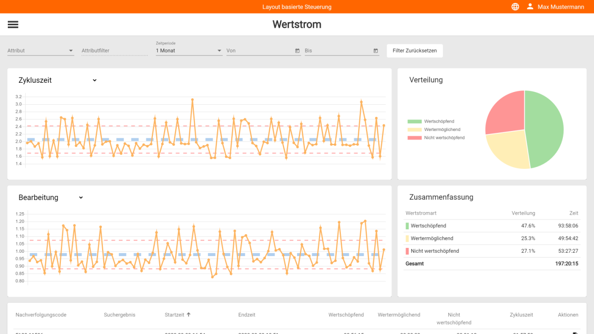 • Wertstromanalyse in Echtzeit über alle Aufträge