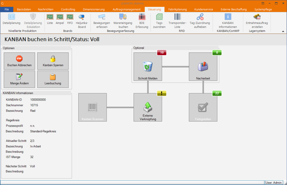 Um die Steuerung übersichtlich und umfassend dokumentierbar zu gestalten, bietet LEANION sowohl manuelle wie auch elektronische KANBAN Karten (eKANBAN) an. Dabei wird sie in der Praxis durch eigens entwickelte, leistungsstarke LEANION Boards unterstützt. Diese bieten neben der Erfassung und dem Druck von Karten auch die Möglichkeit des Barcodescans oder eine RFID-Erkennung an.